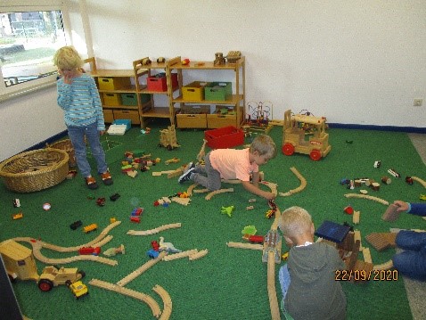 Im Bauraum finden die Kinder Materialien wie verschiedene Bauklötze, große Autos, eine Eisenbahn, Naturmaterialien, z. B. Baumscheiben, Kastanien, verschiedene Hölzer, Steine, Ostheimer Figuren, usw., die zum Konstruieren und zum großen und kleinen Bauen anregen. Auch Puzzles und Steckspiele sind hier zu finden. Das Materialangebot richtet sich nach dem Entwicklungsstand und dem Interesse der Kinder.