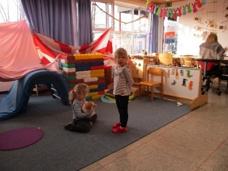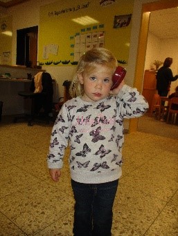 Da sich der Rollenspielbereich über den gesamten Flur erstreckt, ergeben sich verschiedene Spielszenen, wie z. B. Einkaufen, Schminken, Verkleiden und Frisieren, Familie, Arzt spielen.  Unsere Frisierkommode mit ihrem großen Spiegel und dem angrenzendem Verkleidungsregal bietet alles, was man benötigt, um sich in jemand anderen zu verwandeln. Am Ende des Flures, in einer kleinen Nische, befinden sich Puppenmöbel mit Decken und Kissen. Diese sind beweglich. So haben die Kinder die Möglichkeit, sich ihren Spielbereich so zu gestalten, wie sie ihn brauchen. Da die verschiedenen Spielszenen ineinander verschmilzen und sich gegenseitig ergänzen, kommt es zu langen und intensiven Rollenspielen, in denen sich die Kinder mit Situationen und Erfahrungen aus ihrer eigenen Erlebniswelt auseinandersetzen.